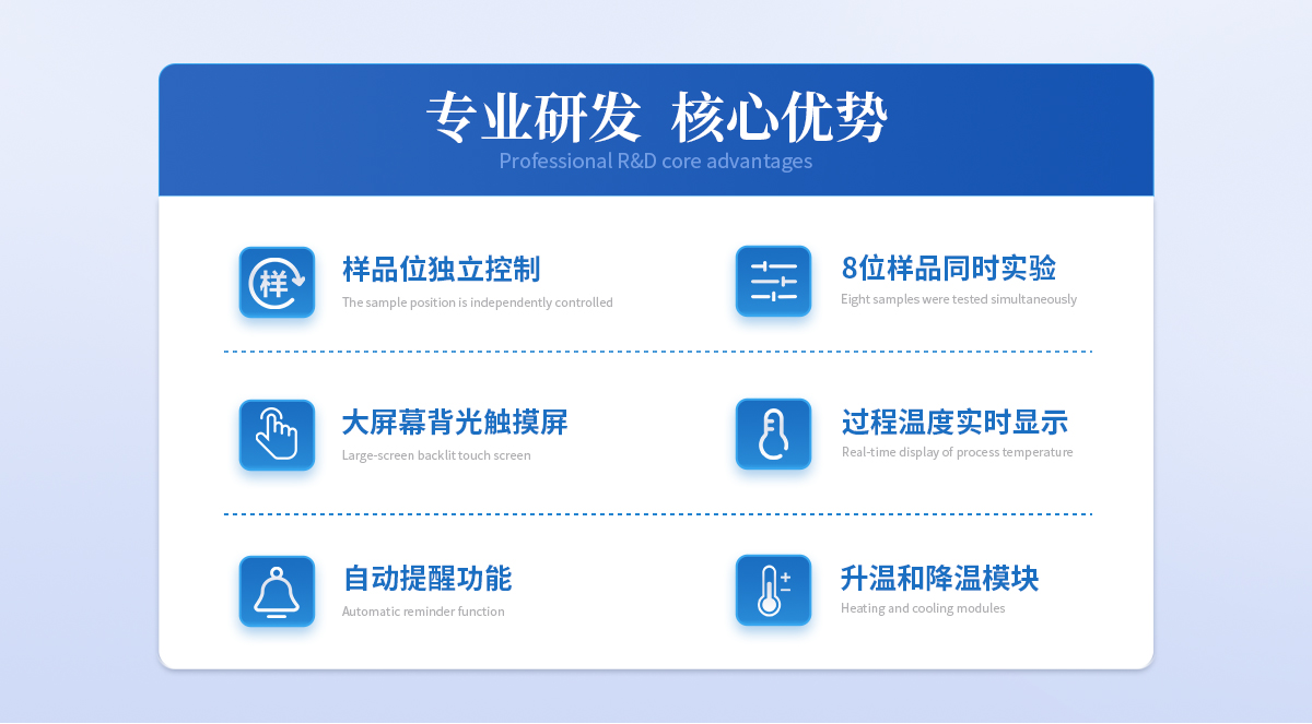 | ◆ 全样品位:8位, | ◆ 样品位可独立控制:每个样品位独立控制,*多实现8位样品同时实验。 | ◆ 恒温控制功能:**的升温和降温模块,自动控制实验操作在恒温25℃下进行,实验过程温度实时显示。 | ◆ 测量提醒功能:到达检测条件后自动提醒功能,保证每次实验的及时进行。 | ◆ 控温精度:25℃±1℃ | ◆ 大屏幕背光触摸屏,方便直观操作。 |