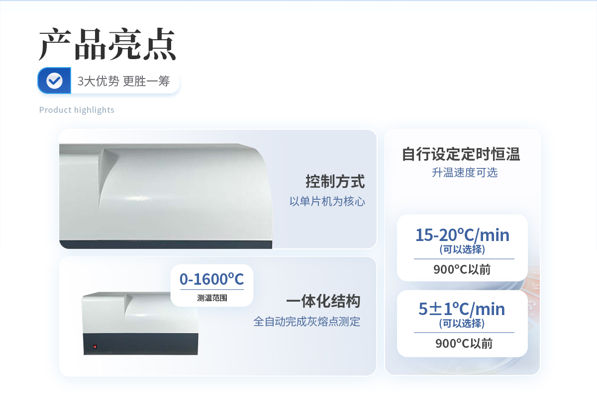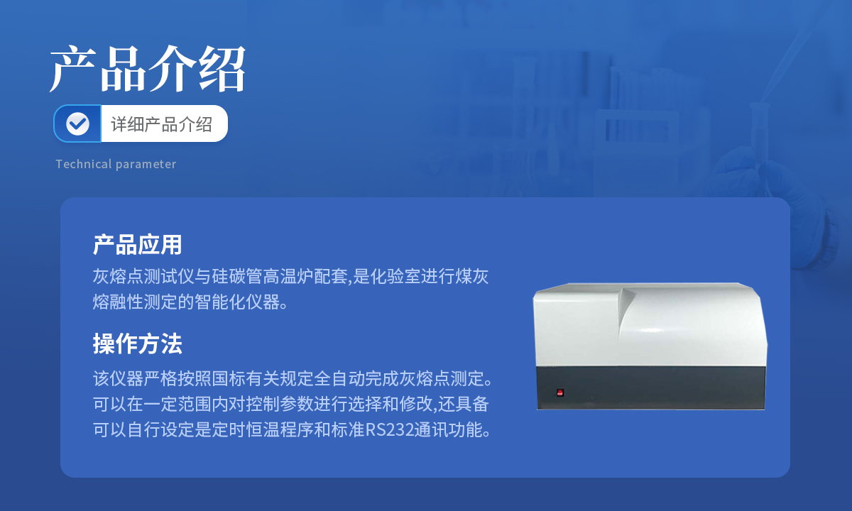灰熔点测试仪与硅碳管高温炉配套,是化验室进行煤灰熔融性测定的智能化仪器.该仪器严格按照国标有关规定全自动完成灰熔点测定.可以在一定范围内对控制参数进行选择和修改,还具备可以自行设定是定时恒温程序和标准RS232通讯功能.