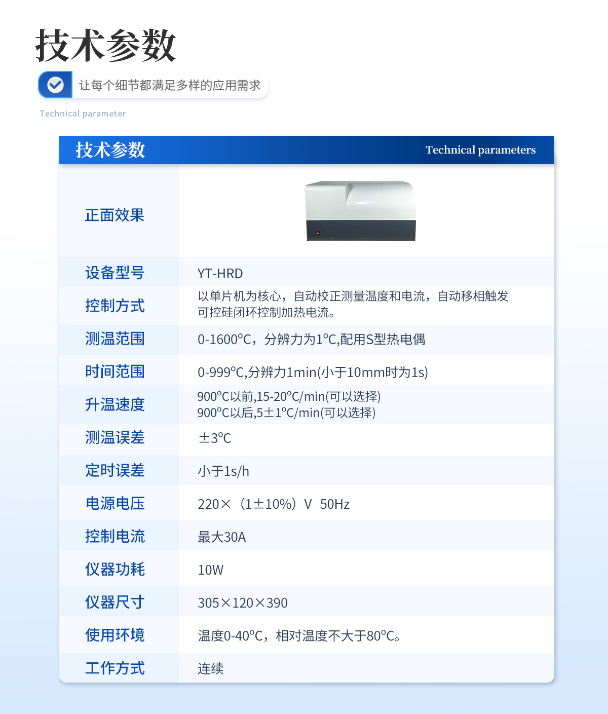 | 1、控制方式:以单片机为核心,自动校正测量温度和电流,自动移相触发可控硅闭环控制加热电流。 | 2、测温范围:0-1600ºC,分辨力为1ºC,配用S型热电偶. | 3、时间范围:0-999ºC,分辨力1min(小于10mm时为1s) | 4、升温速度:900ºC以前,15-20ºC/min(可以选择).900ºC以后,5±1ºC/min(可以选择) | 5、测温误差:±3ºC | 6、定时误差:小于1s/h | 7、电源电压:220×(1±10%)V 50Hz | 8、控制电流:**30A | 9、仪器功耗:10W | 10仪器尺寸(mm):305×120×390 | 11、使用环境:温度0-40ºC,相对温度不大于80ºC | 12、工作方式:连续 |