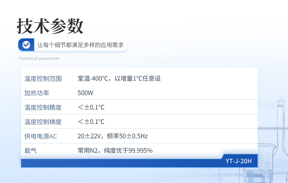 | 温度控制范围:室温-400℃,以增量1℃任意设 | 加热功率:500W | 温度控制精度:<±0.1℃ | 温度控制梯度:<±0.1℃ | 供电电源AC:220±22V,频率50±0.5Hz | 载气:常用N2,纯度优于99.995% |