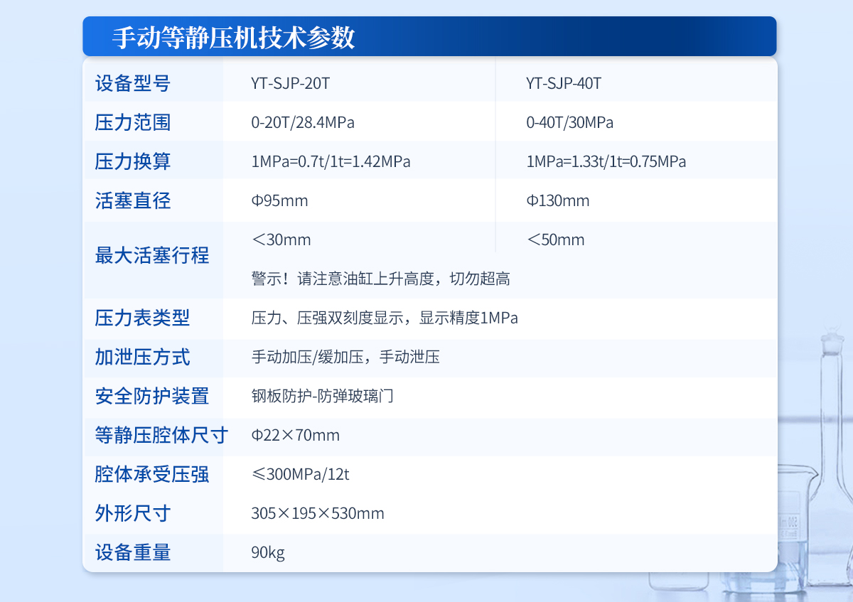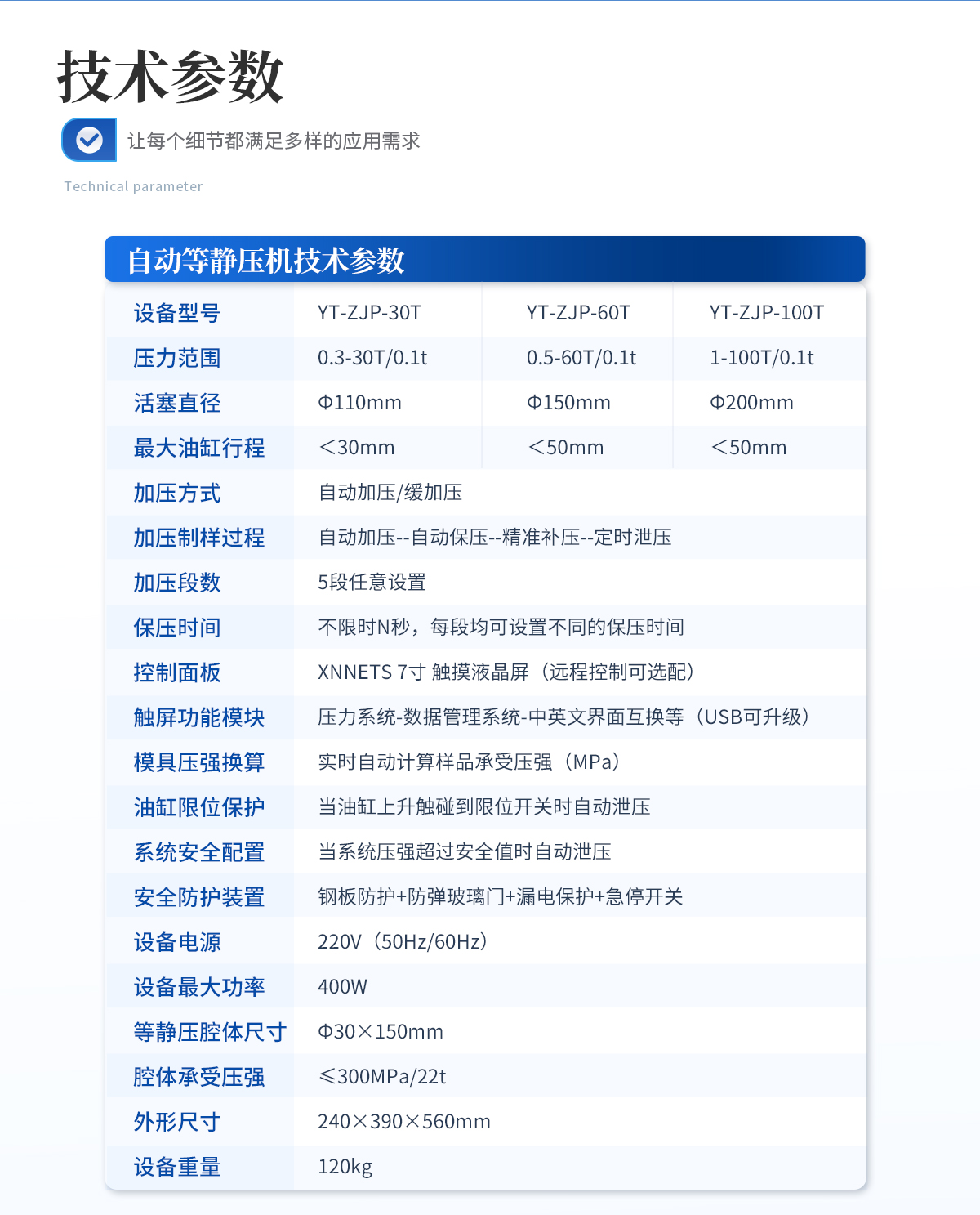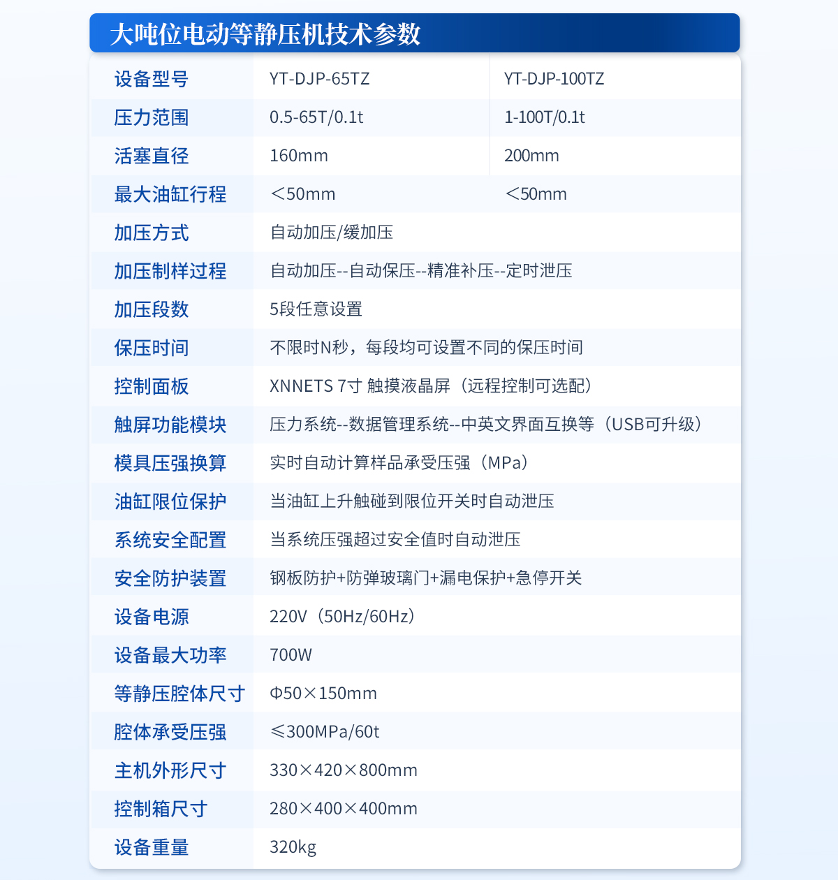 | 规格型号:YT-ZJP-100T | 压力范围:1-100T/0.1t | 活塞直径 :Φ200mm | **油缸行程:<50mm | 加压方式:自动加压/缓加压 | 加压制样过程:自动加压--自动保压--精准补压--定时泄压 | 加压段数:5段任意设置 | 保压时间 :不限时N秒,每段均可设置不同的保压时间 | 控制面板:XNNETS 7寸 触摸液晶屏(远程控制可选配) | 触屏功能模块: 压力系-统-数据管理系统--中英文界面互换等(USB可升级) | 模具压强换算:实时自动计算样品承受压强(MPa) | 油缸限位保护:当油缸上升触碰到限位开关时自动泄压 | 系统安全配置 :当系统压强超过安全值时自动泄压 | 安全防护装置:钢板防护+防弹玻璃门+漏电保护+急停开关 | 设备电源:220V(50Hz/60Hz) | 设备**功率:400W | 等静压腔体尺寸:Φ60×150mm | 腔体承受压强: ≤300MPa/87t | 外形尺寸:330×580×720mm | 设备重量:290kg | 配置说明:等静压机1台!可根据需求定制500MPa等静压机或橡胶模具 |