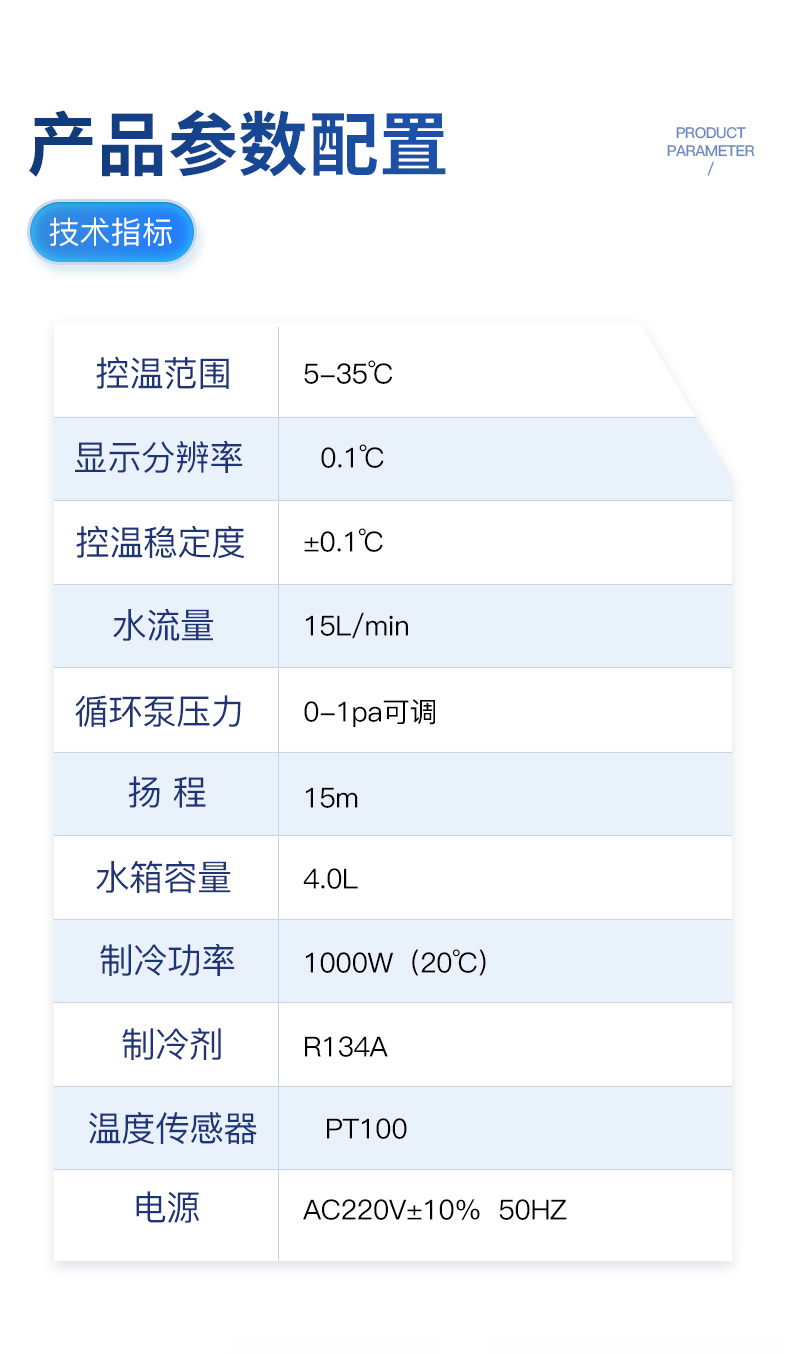 | 电压:220V AC | 频率:50HZ | 工作电流:3.2-8.6A | 压缩机功率:1050W/1.2HP | 制冷量:3KW±5% | 冷媒充注量:R410a/480g | 节流器:毛细管 | **扬程:15m | **流量:12L/min | 水泵功率:55瓦 | 出水口:φ10铜咀宝塔(默认) | 水箱容量:9L | 尺寸:长*宽*高740*480*840mm | 净重:65Kg | 保护:水流保护、水温超高报警、水温超低报警、压缩机过载保护、室温超高报警 |