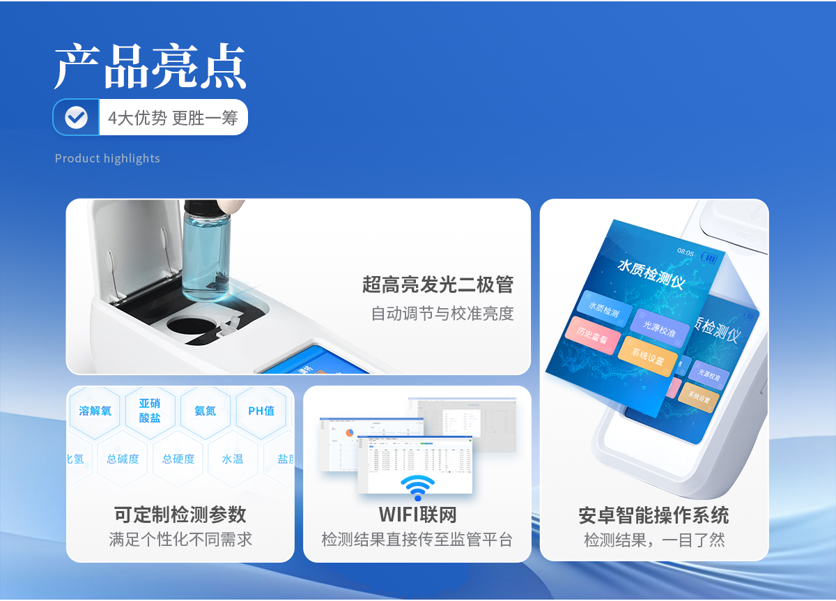 1、采用全新安卓7.1.1智能操作系统,人性化中文操作界面,运转速度更快速,稳定性更强。 2、8英寸液晶触摸屏显示,人性化中文操作界面,读数直观、简单。 3、采用精密比色池设计,使用光源一致,可以解决由于光源误差带来的检测结果误差问题,检测结果更加精准。 4、光源采用进口超高亮发光二极管,光源亮度可以自动调节与校准。 5、支持10mm、30mm、50mm皿比色和φ16mm管比色等比色方式,多元选择,确保测量的准确性; 6、具有无线通讯功能,支持WIFI、RJ45、手机热点联网传输,检测数据亦可通过U盘导出; 7、多功能样品管理,可对样品进行中英文命名,方便样品记录和数据存储; 8、仪器可永久存储800万组数据,为方便大量数据查找,可通过时间检索,并随意选择分析; 9、支持HDMI输出,方便用户培训、讲解、及大屏展示。 10、仪器带有监管云平台,数据可通过局域网和互联网上传,亦可对接上传至环境监管部门平台。 11、内置热敏行式打印机,打印纸上的内容可自由选择(包括二维码打印); 12、交流220V,可选配6ah大容量充电锂电池,方便户外流动测试; 13、内置教学演示视频,用户可一边看仪器内操作视频,一边进行实验操作,更易上手。 14、后期产品固件可升级。