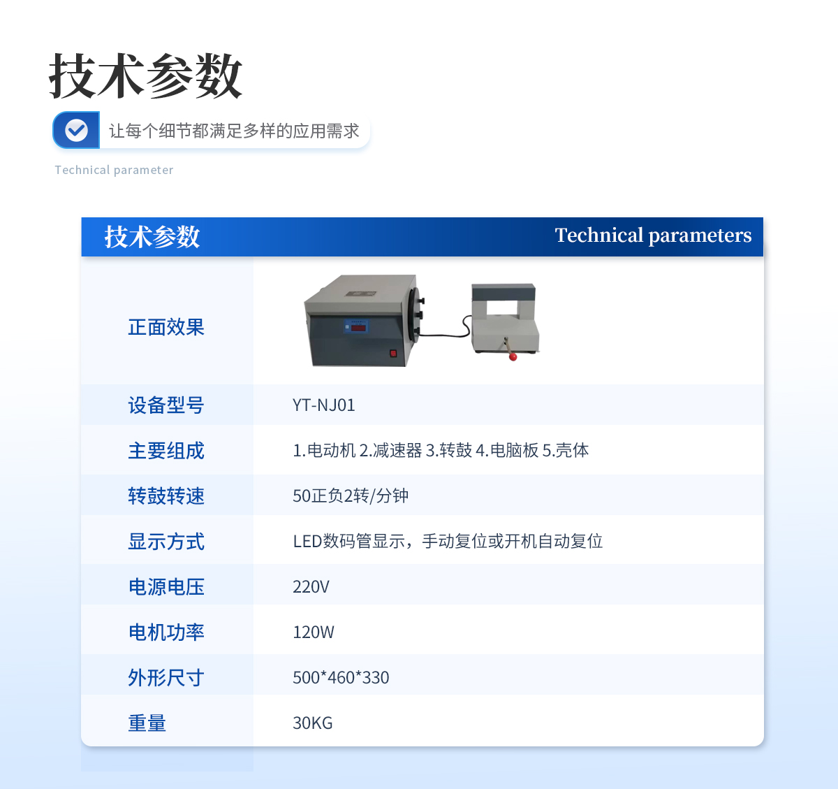 | 1.转鼓转速 50正负2转/分钟 | 2.显示方式 LED数码管显示,手动复位或开机自动复位 | 3.电源电压 220V | 4.电机功率 120W | 5.外形尺寸 500*460*330 | 6.重量 30KG |