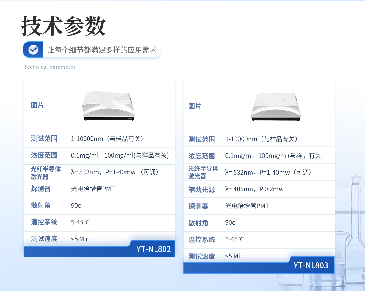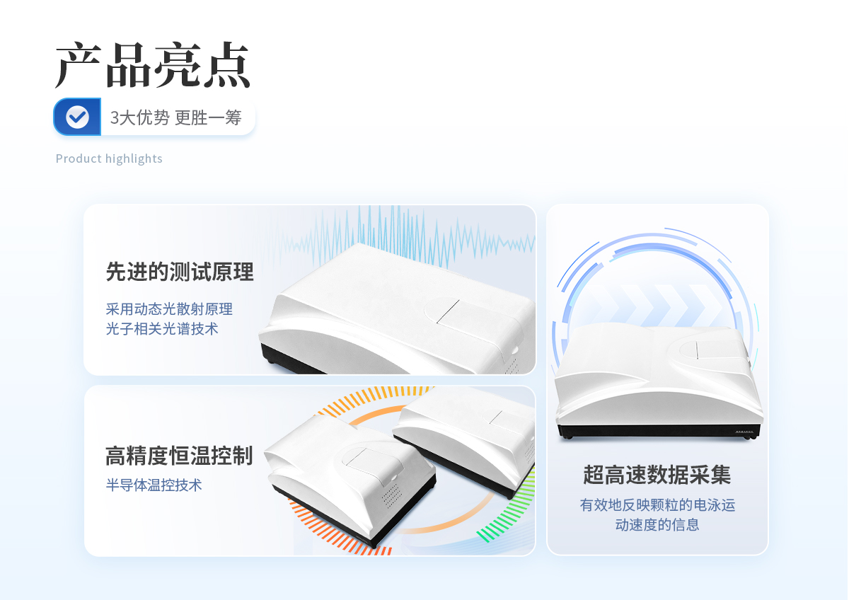 | 双波长激光器,全自动切换 独家采用双波长(λ= 405nm、λ= 532nm)激光器搭建而成的光路系统,相关谱探测系统不仅体积小,而且具有很强的抗干扰能力,从而保证了测试的稳定性;对某些具有吸光属性,传统单一波长激光器无法检测的样品,可进行有效检测; | **的测试原理 采用动态光散射原理和光子相关光谱技术,根据颗粒在液体中的布朗运动速度测定颗粒大小。大小颗粒运动速度不同,激光照射这些颗粒,不同大小的颗粒将使散射光发生快慢不同的涨落起伏。光子相关光谱法就根据特定方向的光子涨落起伏分析其颗粒大小。 | 超高速数据采集 使用PCS技术测定纳米级颗粒大小,必须能够分辨纳秒级信号起伏。本仪器的核心部件采用我公司研制的CR256数字相关器,具有识别8ns的**分辨能力和**的信号处理速度,其数据处理速度高达162M。它能实时完成动态散射光强的采集和自相关函数运算,从而有效地反映不同大小颗粒的动态分光散射信息,为测试结果的准确性典型基础。 | 高灵敏度和信噪比 采用专业级高性能光电倍增管,对光子信号具有**的灵敏度和信噪比。 | 高精度双温控保护系统 采用半导体温控技术,样品池温控系统和激光器温控系统精度高达±0.1℃,使被测样品和激光器光源在整个测试过程中都处于恒温状态,避免温度变化对不测试结果的影响,确保测试准确和重复; | 稳定的光路系统 采用光纤技术搭建而成的光路系统,使光子相关谱探测系统不仅体积小,而且具有很强的抗干扰能力,从而保证了测试的稳定性。 |