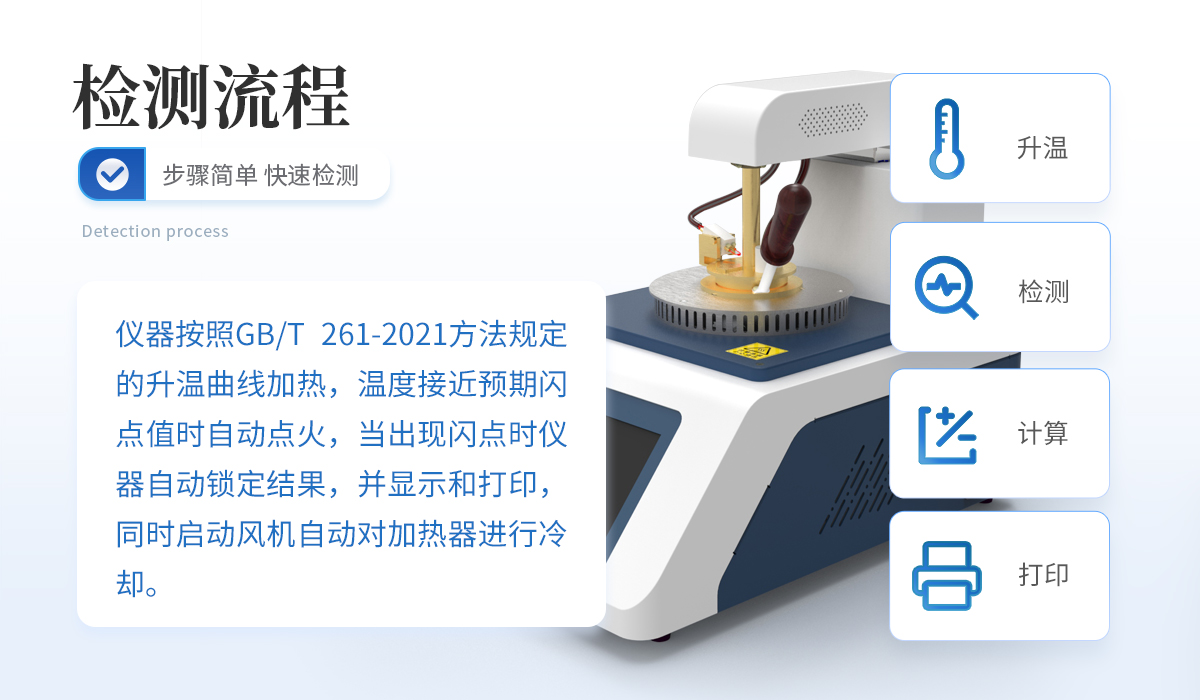 仪器按照GB/T 3536—2008方法规定的升温曲线加热,温度接近预设闪点值时自动点火,当出现闪点和燃点时仪器自动锁定结果,并显示和打印,同时启动风机自动对加热器进行冷却。