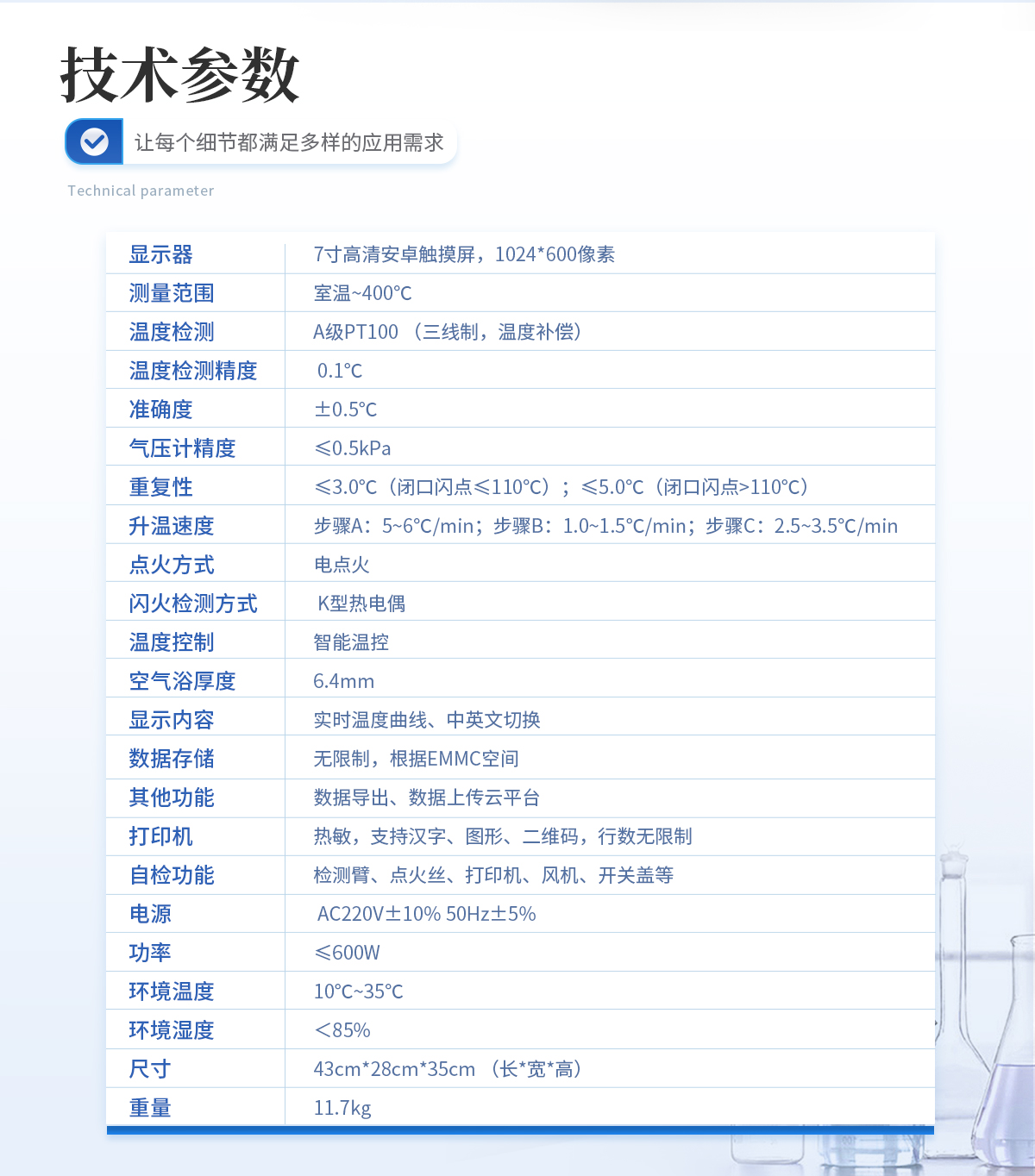 | 显示器:7寸高清安卓触摸屏,1024*600像素 | 测量范围:室温~400℃ | 温度检测: A级PT100 (三线制,温度补偿) | 温度检测精度:0.1℃ | 气压计精度: ≤0.5kPa | 重复性:≤4℃ | 升温速度:预期闪点56℃前为14℃-17℃/min;预期闪点前23℃开始为5℃-6℃/min. | 点火方式:电点火 | 闪火检测方式:火焰离子检测 | 燃点功能:自动锁定燃点值 | 冷却方式:强制风冷 | 温度控制:智能温控 | 显示内容:实时温度曲线、中英文切换 | 数据存储:无限制,根据EMMC空间 | 其他功能:数据导出、数据上传云平台 | 打印机:热敏,支持汉字、图形、二维码,行数无限制 | 自检功能:检测臂、划扫杆、点火丝、打印机、风机等 | 电源:AC220V±10% 50Hz±5% | 功率:≤600W | 环境温度:10℃~35℃ | 环境湿度:<85% | 尺寸:43cm*28cm*35cm (长*宽*高) | 重量:11.3kg |