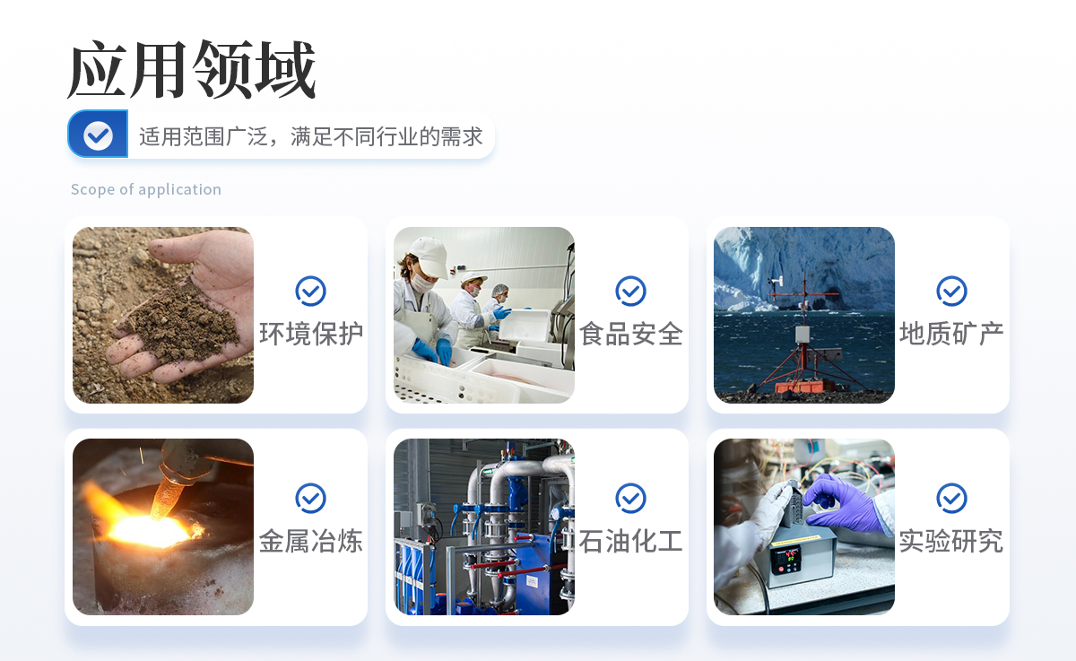 原子荧光光谱仪的应用领域较为广泛,主要测试样品中 11 种超痕量元素的含量,**检测下限可达千亿分之一级。应用领域包括水质、土壤、大气等样环境检测项目、食品检验、检验检疫、药品检验、化妆品检验、土壤饲料肥料检验、地质矿产测试、冶金样品检验、教学研究等。