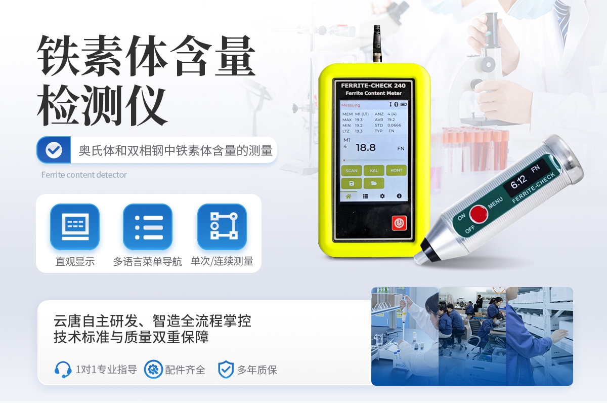 FERRITE-CHECK 240铁素体含量检测仪采用分体式的设计,使用方便,仪器符合Basel标准DIN EN ISO 8249,使用磁感应法测量奥氏体钢和双相钢中的铁素体含量。 全新测头