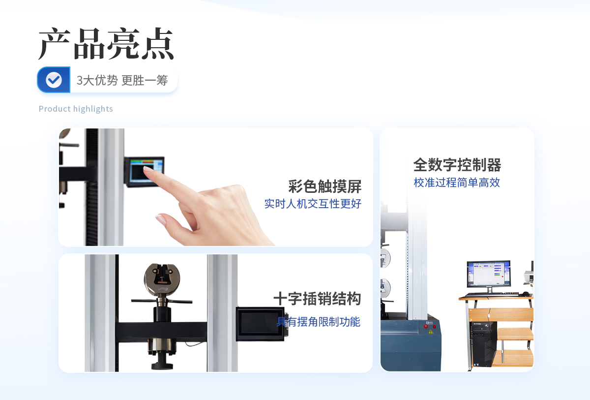 | (1)采用高精度、全数字调速系统及精密减速系统,驱动精密丝杠副进行试验,实现试验速度的大范围调节,试验过程噪音低、运行平稳。 | (2)可选用万向节十字插销结构,一方面便于试样夹持,保证试验同心度,另一方面很好的消除了不规则试样对传感器的影响。 | (3)Windows操作系统,人性化操作界面,可显示试验方法选择界面、试验参数选择界面、试验操作及结果显示界面和曲线显示界面,并可实时显示各参数曲线,便于试验数据分析,过程监控。 | (4)可实现试样装夹时横梁快慢升降调整,具有过流、过压、过载等保护装置。 | (5)带打印功能,可直接实现试验过程的控制及数据的存储、打印。 |