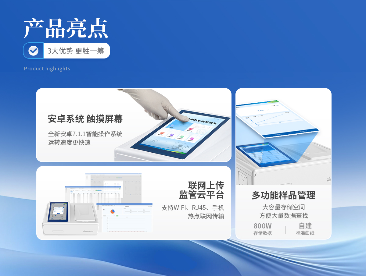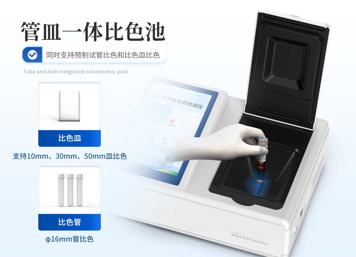 1、采用全新安卓7.1.1智能操作系统,人性化中文操作界面,运转速度更快速,稳定性更强。 2、10.1英寸液晶触摸屏显示,人性化中文操作界面,读数直观、简单。 3、采用精密比色池设计,使用光源一致,可以解决由于光源误差带来的检测结果误差问题,检测结果更加精准。 4、光源采用进口超高亮发光二极管,光源亮度可以自动调节与校准。 5、支持10mm、30mm、40mm、50mm皿比色和φ16mm管比色等比色方式,多元选择,确保测量的准确性; 6、具有无线通讯功能,支持WIFI、RJ45、手机热点联网传输,检测数据亦可通过U盘导出; 7、多功能样品管理,可对样品进行中英文命名,方便样品记录和数据存储; 8、仪器可永久存储800万组数据,为方便大量数据查找,可通过时间检索,并随意选择分析; 9、支持HDMI输出,方便用户培训、讲解、及大屏展示。 10、仪器带有监管云平台,数据可通过局域网和互联网上传,亦可对接上传至环境监管部门平台。 11、内置热敏行式打印机,打印纸上的内容可自由选择(包括二维码打印); 12、交流220V,可选配6ah大容量充电锂电池,方便户外流动测试; 13、内置教学演示视频,用户可一边看仪器内操作视频,一边进行实验操作,更易上手。 14、后期产品固件可升级。