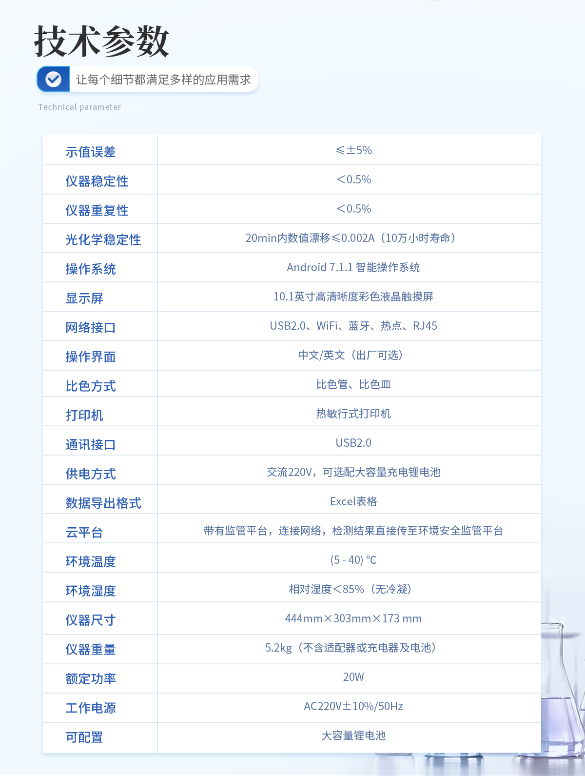 示值误差:≤±5%; 仪器稳定性:<0.5%; 仪器重复性:<0.5%; 光化学稳定性:20min内数值漂移≤0.002A(10万小时寿命); 检测量程:0.004-0.05mg/L; 检测下限:0.004mg/L; 分辨率:0.001mg/L; 比色方式:支持10mm、30mm、40mm、50mm皿比色和φ16mm管比色等比色方式 操作系统:Android7.1.1智能操作系统; 操作界面:中文或英文操作界面; 显示屏:10.1英寸高清晰度彩色液晶触摸屏; 网络接口:USB2.0、HDMI、WiFi、蓝牙、热点、RJ45; 云平台:仪器带有监管平台,连接有线/无线网络,检测结果直接传输至环境安全监管平台; 打印机:热敏行式打印机; 数据储存:800万组,可自由调用查看; 数据导出格式:Excel表格; 仪器尺寸:367x243x125mm; 仪器重量:5.3kg; 环境温度:(5-40)℃; 环境湿度:相对湿度<85%(无冷凝); 额定功率:10W; 工作电源:AC220V±10%/50Hz; 可配置:大容量锂电池。