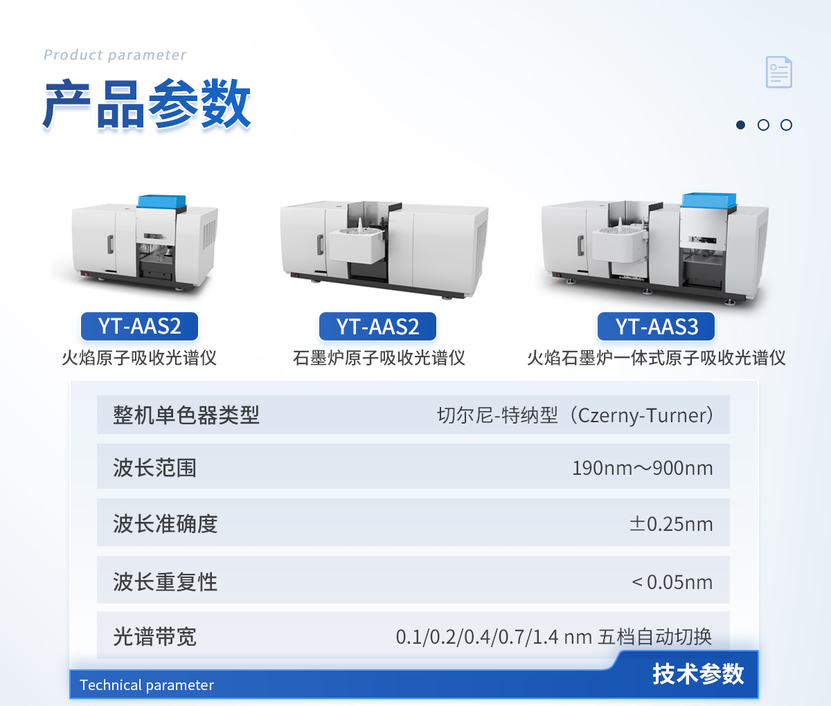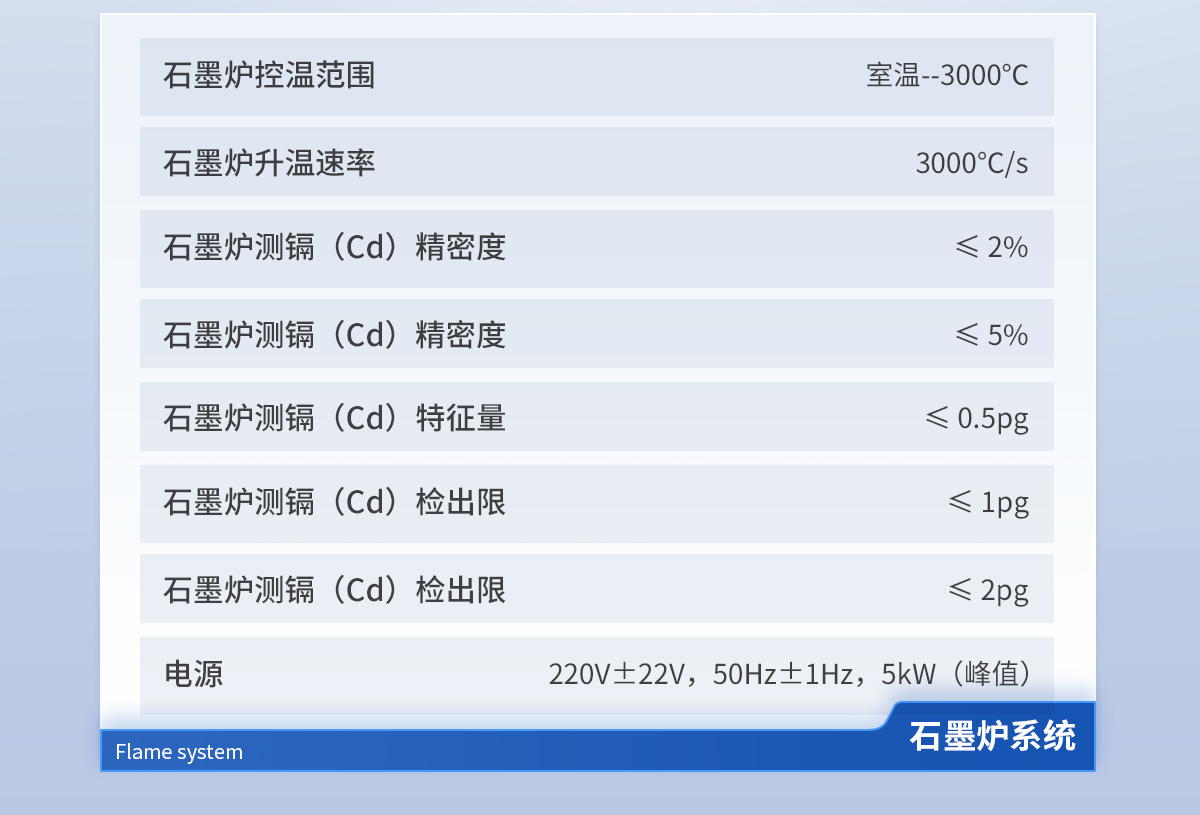 波长范围:185nm~900nm 自动寻峰设置单色器类型:切尔尼-特纳型(Czerny-Turner 型) 光谱带宽:0.1/0.2/0.4/0.7/1.4 nm 五档自动切换 光栅闪耀波长:230nm 光栅刻线:1800 线/mm 波长准确度:≤±0.2nm 波长重复性:< 0.10nm 分辨率:优于 0.3nm 静态基线稳定性:0.003 Abs(static) 氘灯背景校正能力:60 倍以上 石墨炉控温范围:室温--3000℃ 石墨炉升温速率:3000℃/s 石墨炉测镉(Cd)精密度:≤ 2% 石墨炉测镉(Cd)特征量:≤ 0.5pg 石墨炉测镉(Cd)检出限:≤ 1pg 电源:220V±22V,50Hz±1Hz,5kW(峰值)