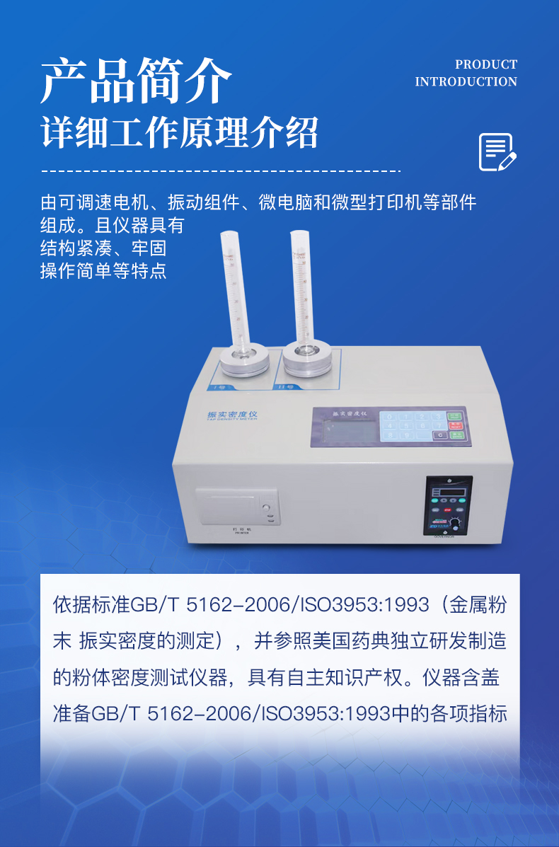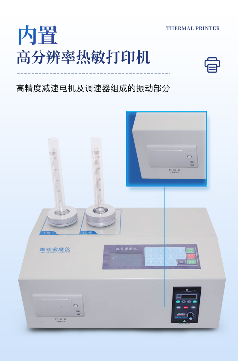 简介:技术原理:YT-ZS2型粉体密度测试仪是由丹东市恒瑞仪器有限公司依据标准GB/T 5162-2006/ISO3953:1993(金属粉末 振实密度的测定),并参照美国药典独立研发制造的粉体密度测试仪器,具有自主知识产权。仪器含盖准备GB/T 5162-2006/ISO3953:1993中的各项指标。YT-ZS2型粉体密度测试仪由可调速电机、振动组件、微电脑和微型打印